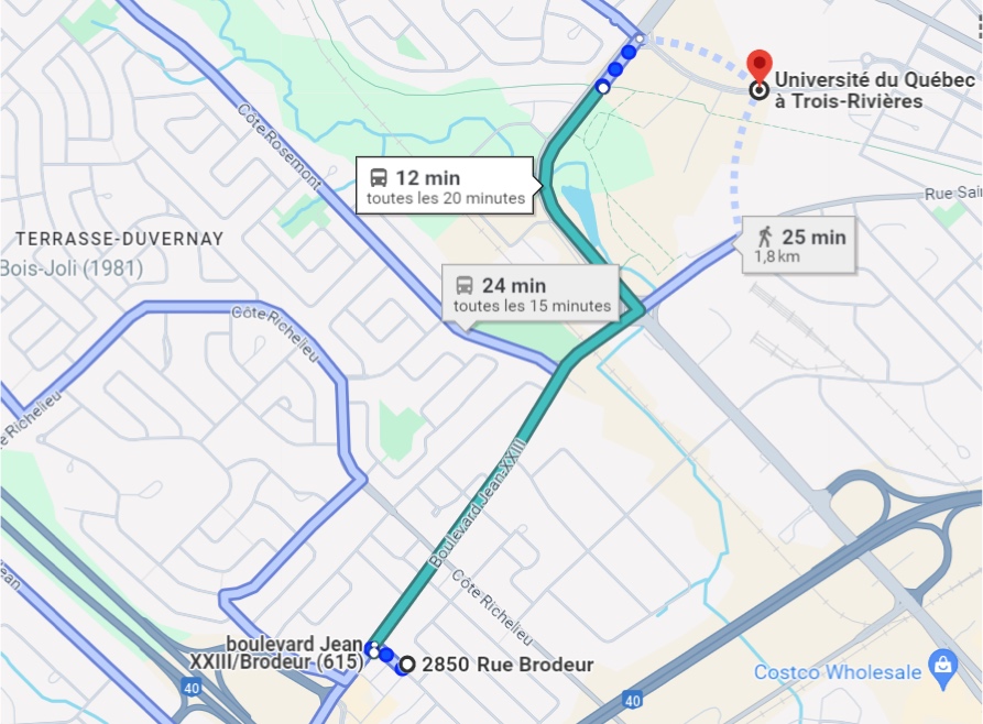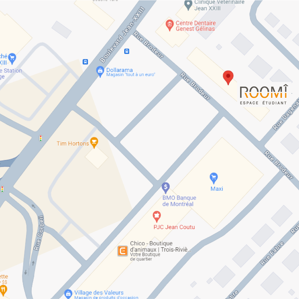 Roomî se situe au 2850 rue Brodeur, à quelques minutes de nombreux commerces tels que des épiceries, une pharmacie, des restaurants rapides et bien plus encore. Ce logement étudiant à Trois-Rivières te permet d’accéder facilement à une variété de magasins et services essentiels à ta vie quotidienne.